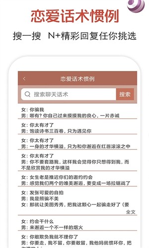 1、100w多的恋爱话术,搜一下n条精彩回复任由你来进行相关的挑选,让你的恋爱词汇更加的丰富,话语更加的吸引人。
