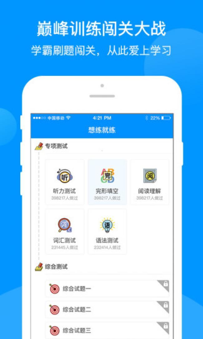 巅峰训练app下载安装是一款英语学习软件,软件结合年级课本内容与海量的资源库,覆盖听力专项训练、智能测评、错题整理及社区互动等功能,支持用户通过原创试题强化考试应对能力。其特色在于以测评结果为起点,为每个用户生成个性化学习路径,并配套专业导师指导与动态学情分析,实现针对性提升。同时还整合了听力素材,精选课程以及碎片化练习模式,全面的帮助用户高效的了解自己的知识薄弱点,进行深入的学习。全面快速的提升用户的英语水平。喜欢的伙伴们快来下载试试吧。