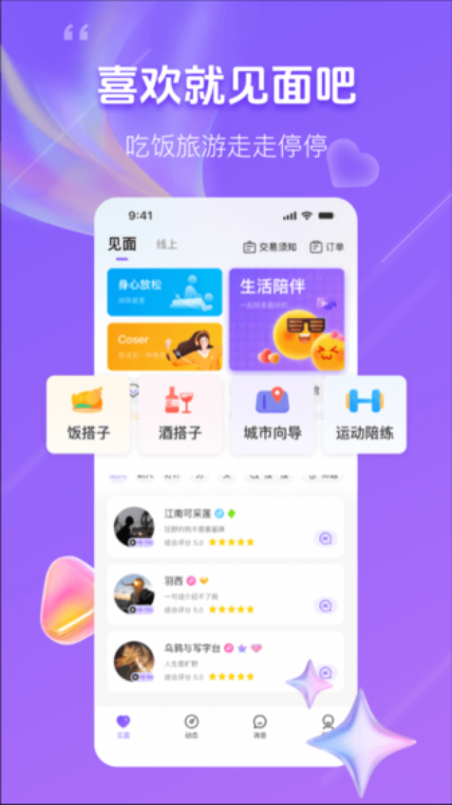 2、支援找伴儿,使用者可以在任何时候找到饭伴、酒伴、运动伴等等。