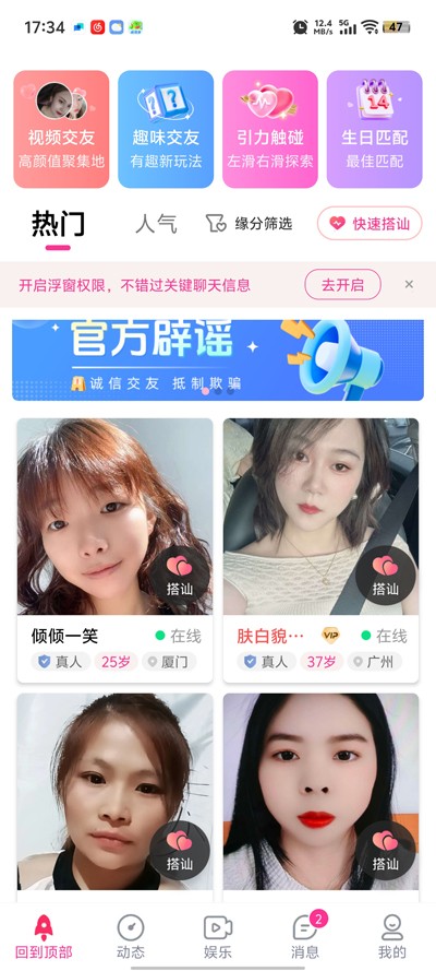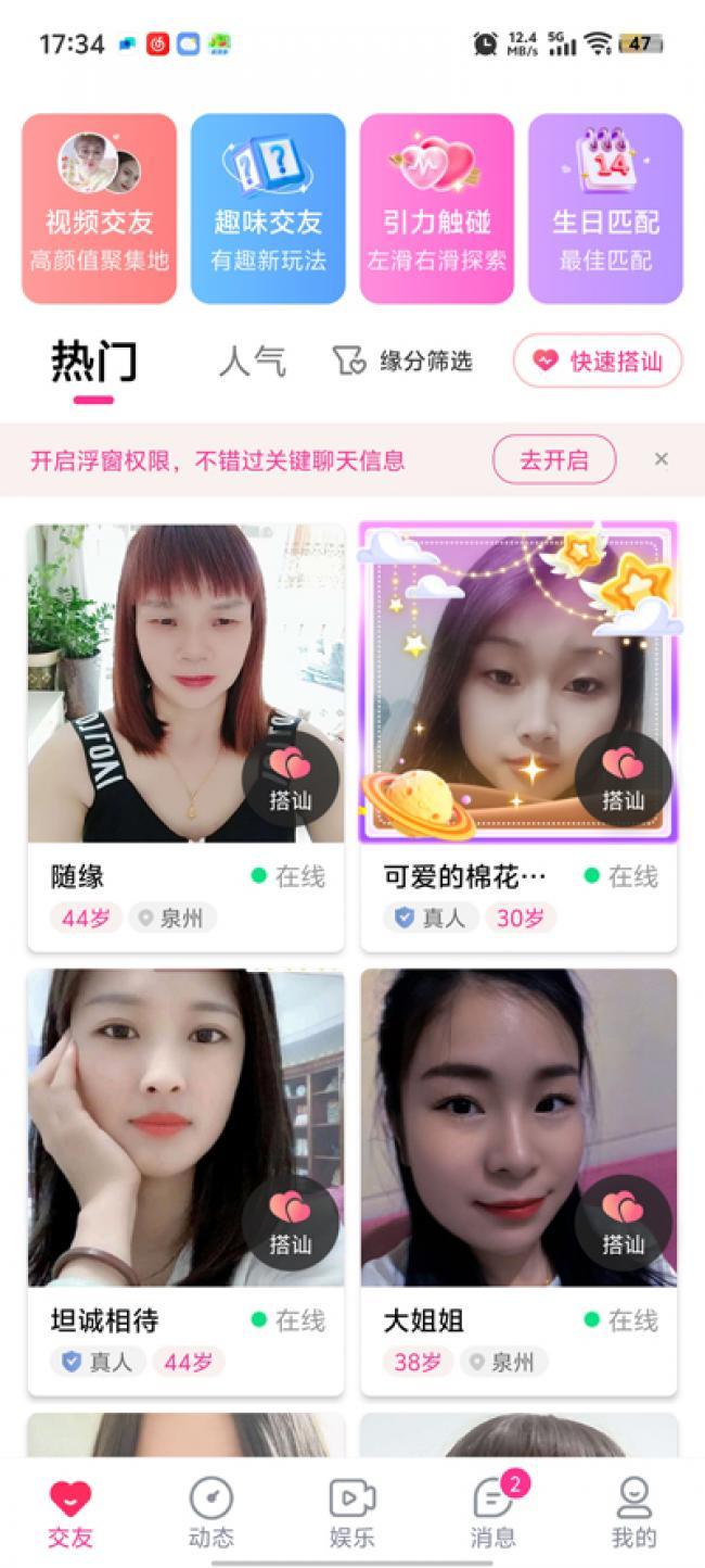 缘缘交友app最新版下载是一款功能全面的社交软件,它可以帮你轻松拓展自己的社交,帮你轻松拓展自己的社交,不论是交友还是恋爱都是不错的选择,多种社交功能可以自由选择,不论是交友还是恋爱都是不错的选择,你可以根据自己的需求自由选择,大大提高了用户脱单的概率,帮你早日找到适合自己的另一半,非常适合当代年轻人使用,所有用户都经过了实名认证,你可以放心和他人深入交流,完全不用担心隐私泄露或照骗的情况,如果你也喜欢这款软件的话,软件站现有最新版本,那就快来下载吧。