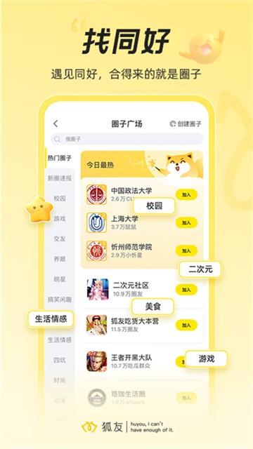 1、狐友圈已经开启了一个新的圈子,玩家可以申请建立一个新的圈子,成为这个圈子的主人。