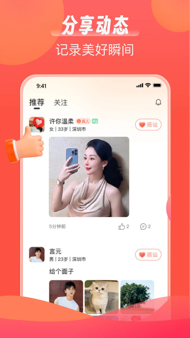 1、同城推荐,智能匹配帮你找到有缘人,分享生活,发现身边有趣的人。
