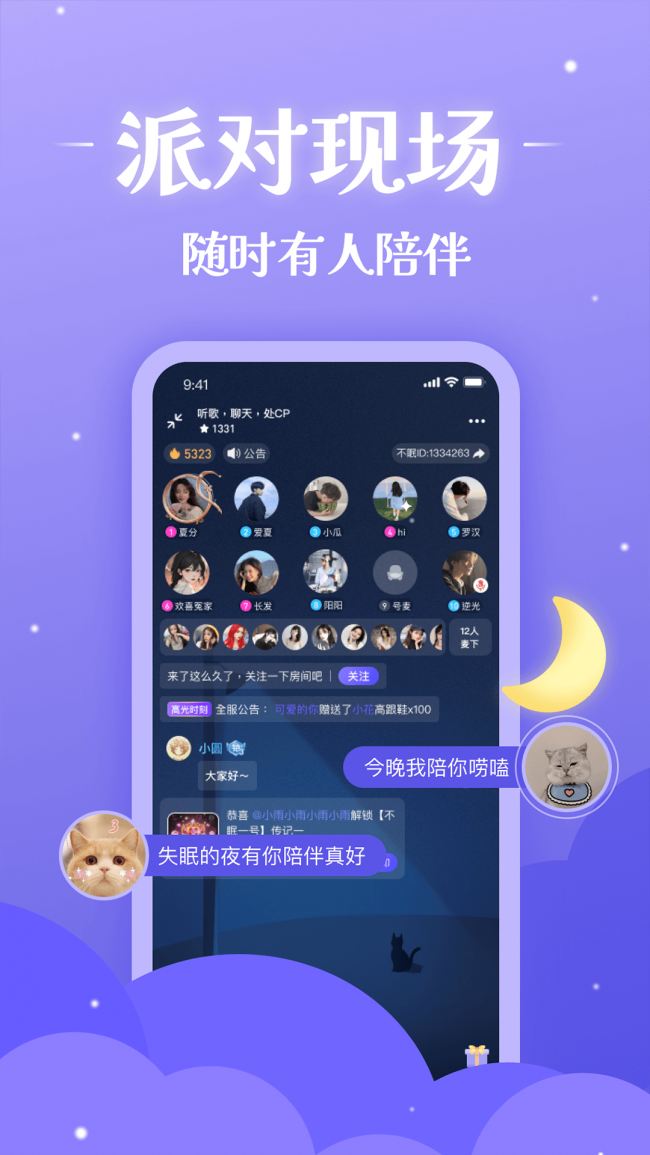 2、里面的派对好会随时随地的陪伴在用户的身旁,帮助用户告别夜晚的孤单。
