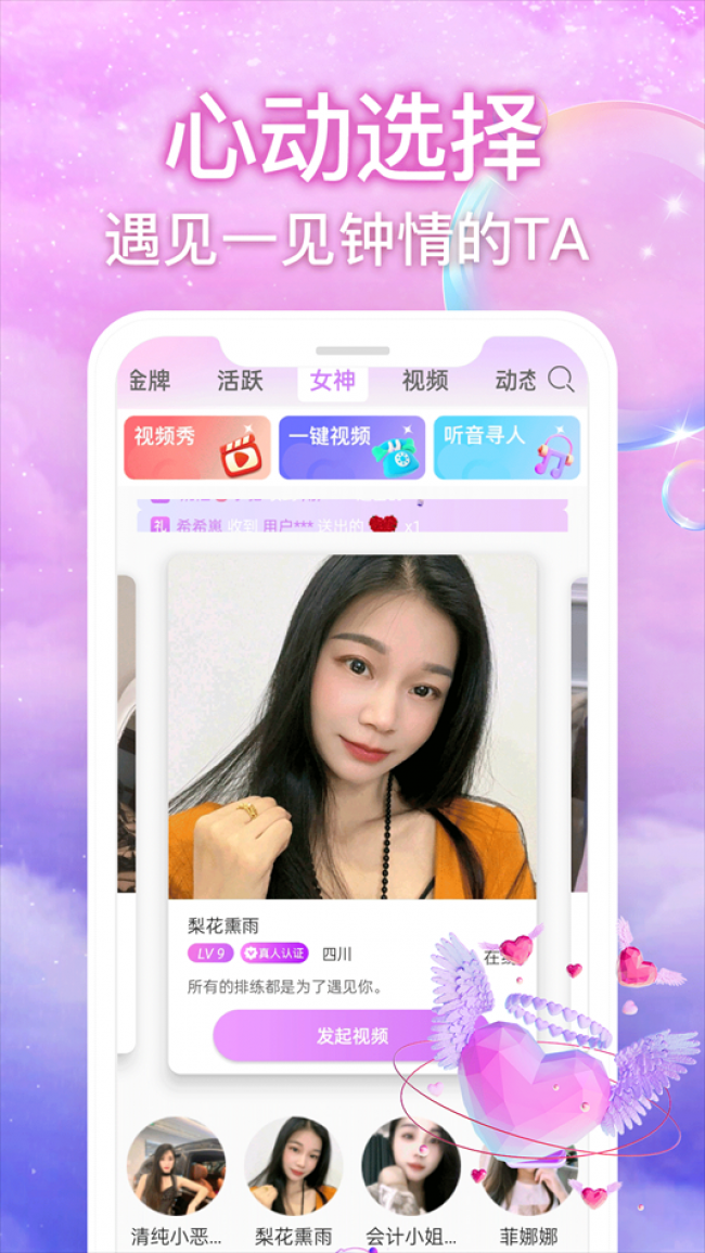 2、打造零距离陌生人聊天交友视频聊天语音交友,让你的交友充满别样情趣,找到与你心灵契合的聊天伴侣!