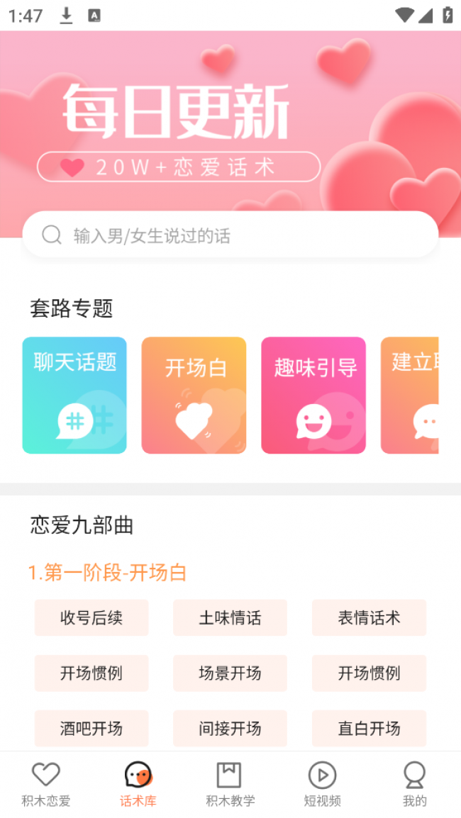 1、积木恋爱话术app复制黏贴软件中的回复,各种聊天话术助你轻松脱单。