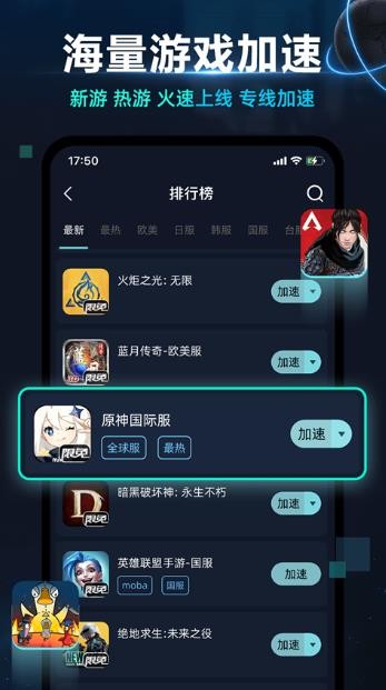 1、热门游戏全覆盖,支持3000+手游加速,专业加速吃鸡类等游戏一键加速,高玩的选择,你游戏的助手,体验游戏超快感。