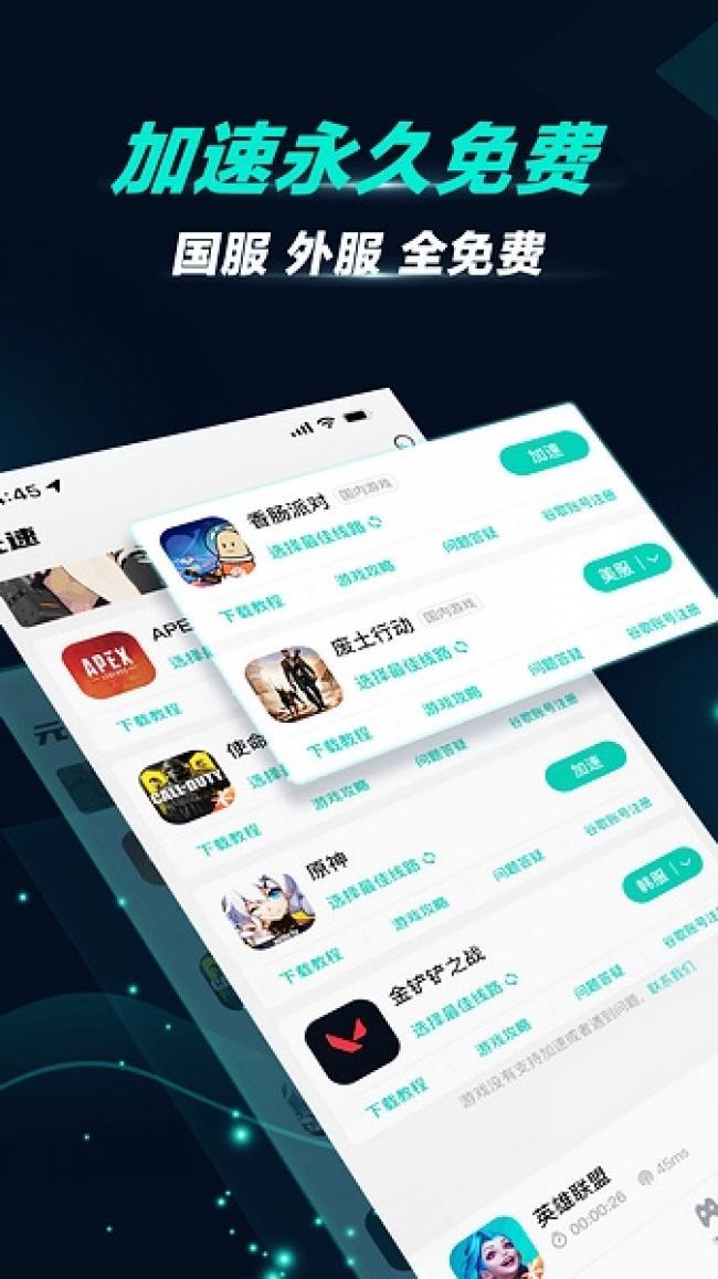 2、元速加速器,一款真正的免费手游加速器,无需会员,一键解决手游网络卡顿、延迟、掉线、加载缓慢等问题,