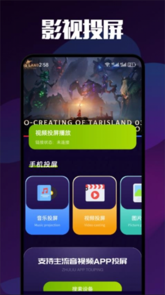 1、首页提供视频、照片和音乐三种屏幕投影选项,用户可以根据自己的需求快速选择。