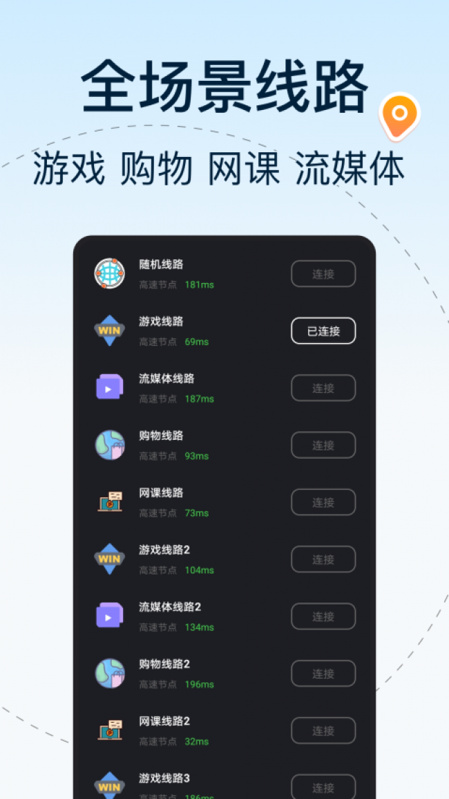 2、让你获取不同的网络加速节点,按照不同的使用需求选择合适的节点进行加速。