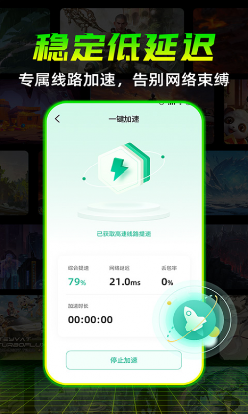 1、帮助你实现各种稳定的手机网络加速,让手机网络速度更稳定,不会出现任何的高延迟问题。