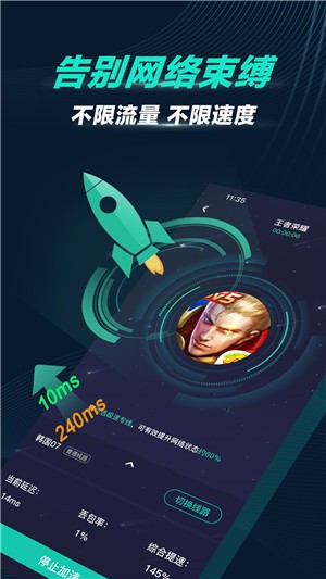 1、Wi-Fi/4G网络智能切换,有效提高游戏内的稳定性,减少红色延迟和卡顿,保障绿色网络体验常在!