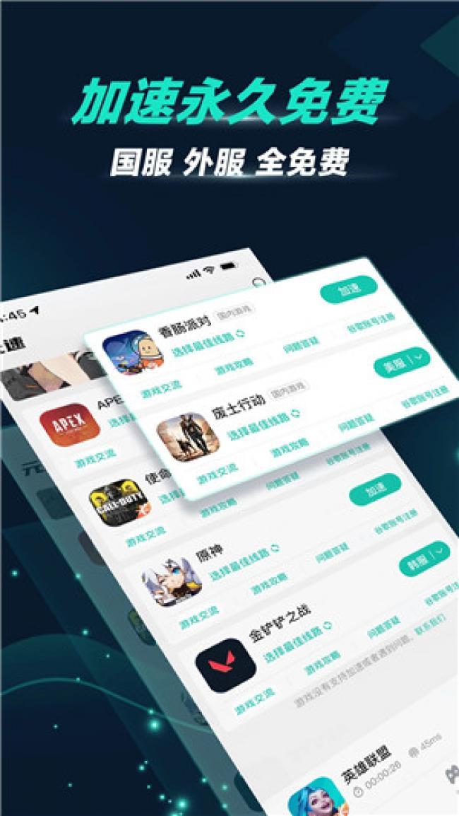 1、元速加速器一款真正的免费手游加速器,无需会员,一键解决手游网络卡顿、延迟、掉线、加载缓慢等问题,