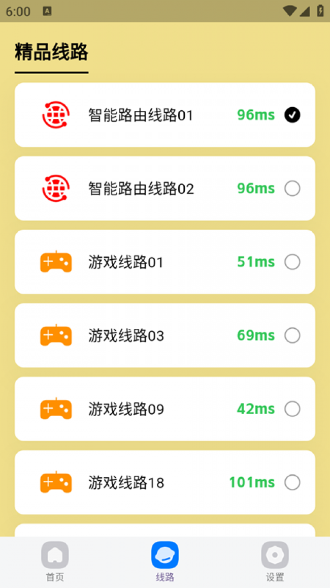 1、内置“精品线路”“游戏线路”“影音线路”等多类型节点,系统自动匹配最优节点,支持手动切换。
