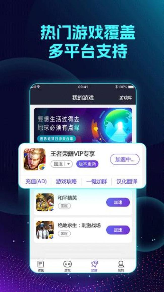 2、千款游戏完美加速:lol手游、王者荣耀、绝地求生:刺激战场、QQ 飞车、英雄联盟手游、等热门游戏应有尽有。