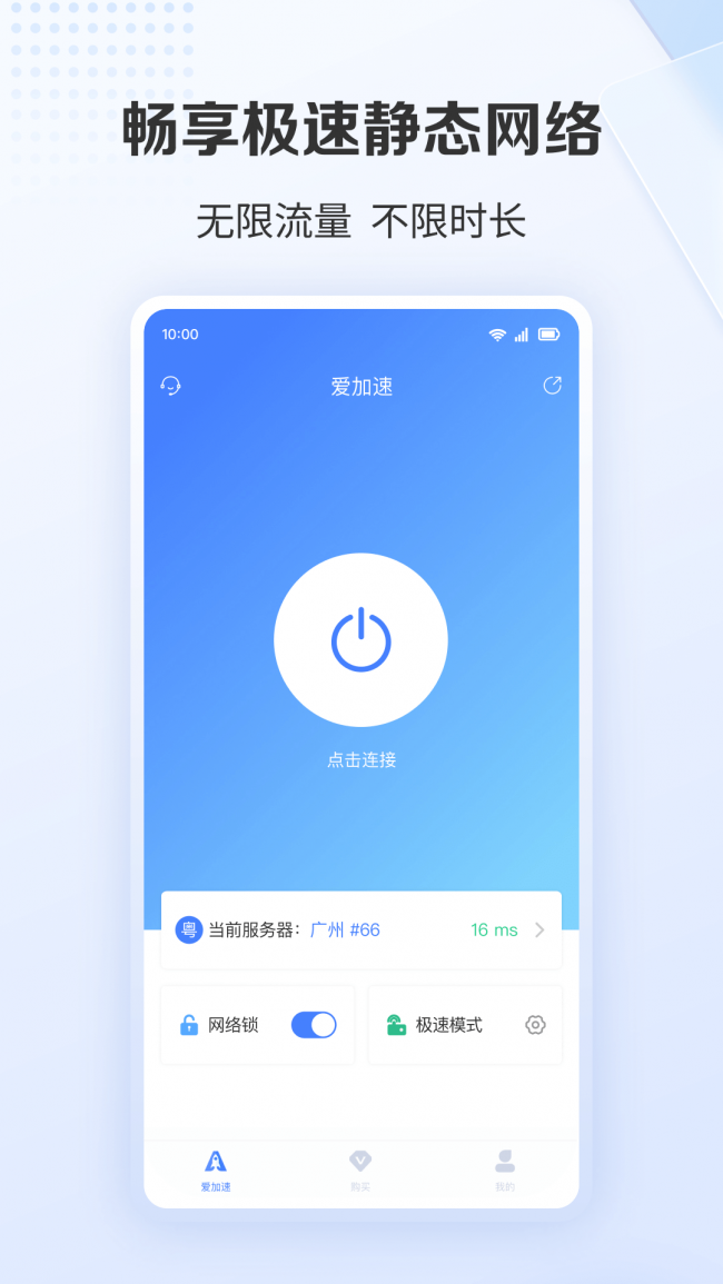 3、爱加速是一款静态网络接入软件(静态IP代理),提供境内的网络加速服务。