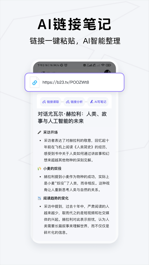 get笔记app下载是一款拥有智能AI技术的智能记录软件,可以在其中选择不同的方式进行智能化记录,这样就可以更加轻松的记录更多的内容,在这里你可以轻松记录自己的生活、灵感、观后感以及日记等不同的内容,让你可以更加详细的记录更多笔记,并且还能将图片、链接、录音等内容保存在软件中进行解析,可以智能的为你解析其中的内容并转换成文字形式进行记录,同时还可以为你提供智能润色处理,能够帮助你轻松提升文章的内容品质,而且还会为你提供强大的隐私保护功能,让你记录的内容不会被泄露出去。喜欢的伙伴们快来下载试试吧。
