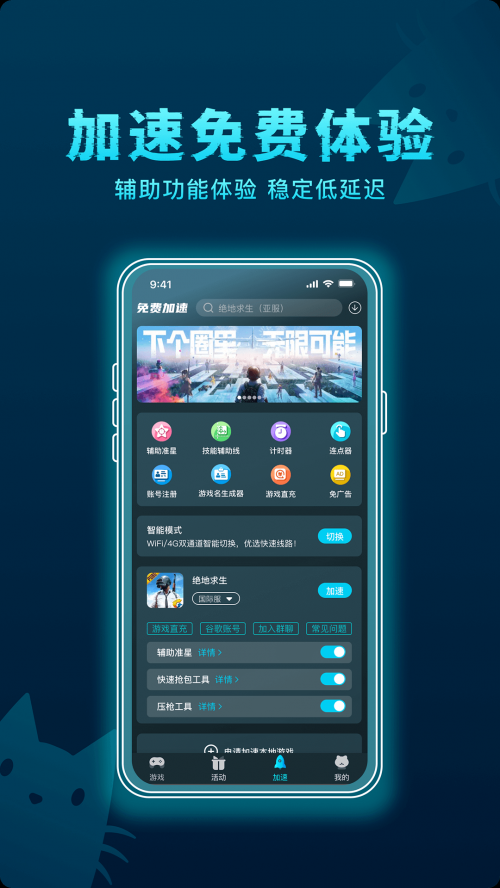1、覆盖全球加速,智能匹配优质线路,Wi-Fi/4G网络智能切换,加速国服、国际服、欧美服、亚服、日韩服、等。