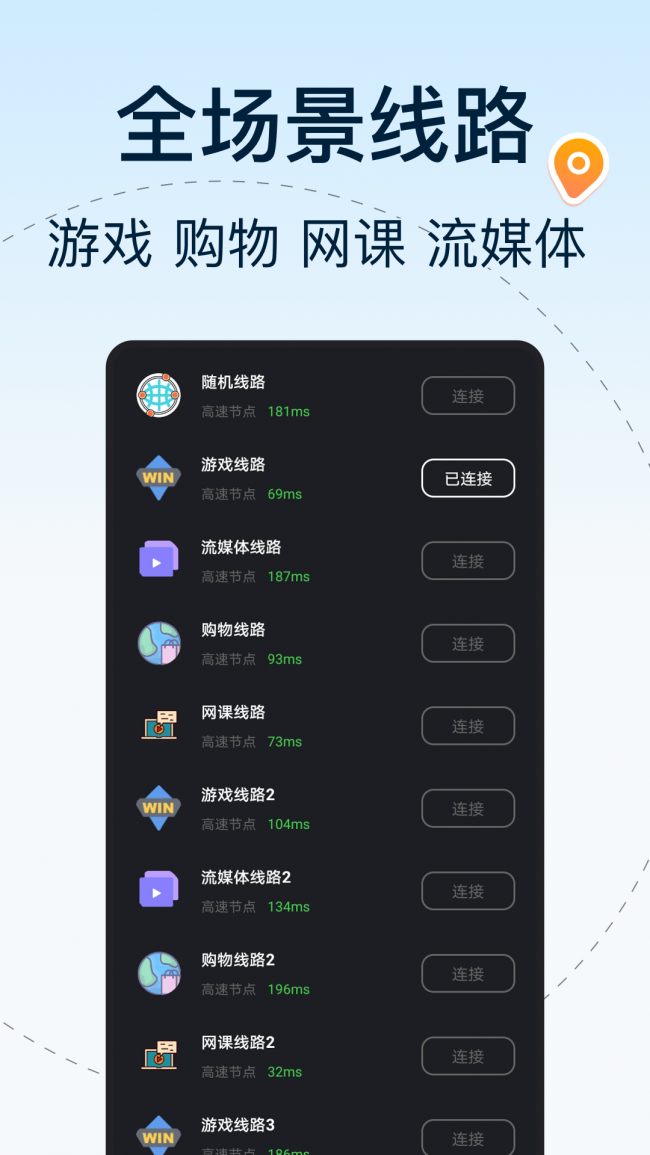 1、对全球游戏进行特殊优化,减少网络延迟,降低丢包率,减少卡顿,解决游戏移动网络下容易掉线、联机困难等问题。