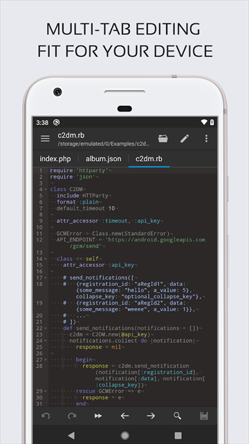 2、支持物理键盘,包括按键组合,3个应用主题和30多个语法高亮主题。