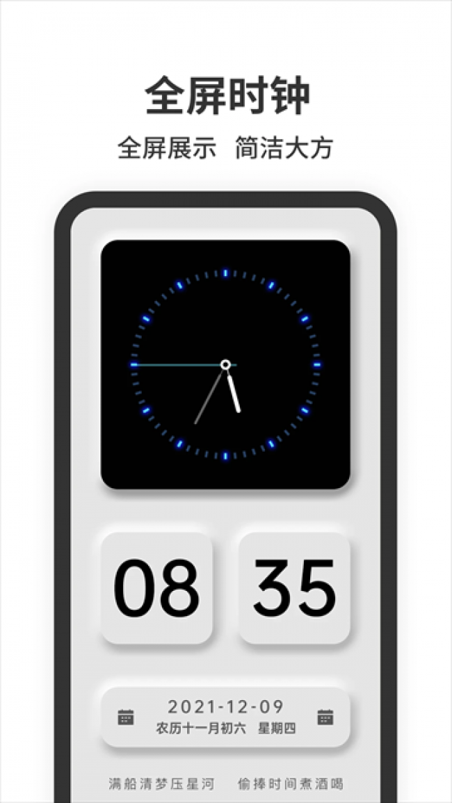 1、超大模拟时钟、数字时钟全屏显示在手机上,简洁大气。