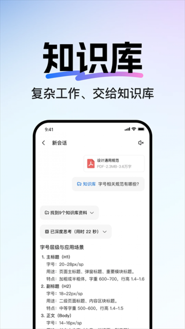 1、通过知识库,用户可以将自己的工作学习资料上传,AI将帮助用户提取、归纳、分析、补充和优化知识体系,从而将通用的大模型转化为专属的个人助理。
