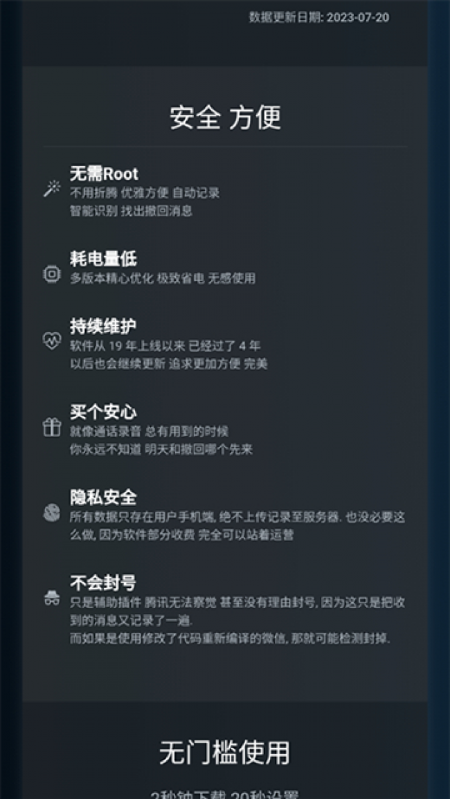 1、多版本精心优化、极致省电、无感使用,不用折腾、优雅方便、自动记录,智能识别,找出撤回消息。