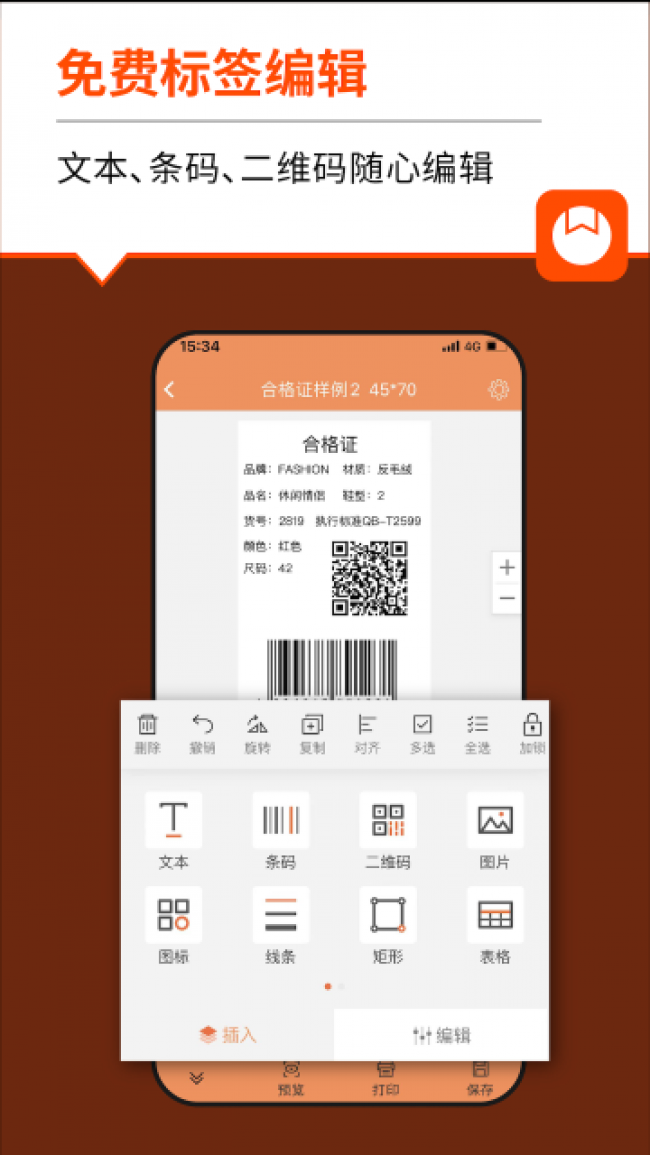 2、支持文字、条码/二维码、图片/图形、线条/矩形、免费表格编辑功能;可设置多字体、字号等,轻松设计任何形式的条码。