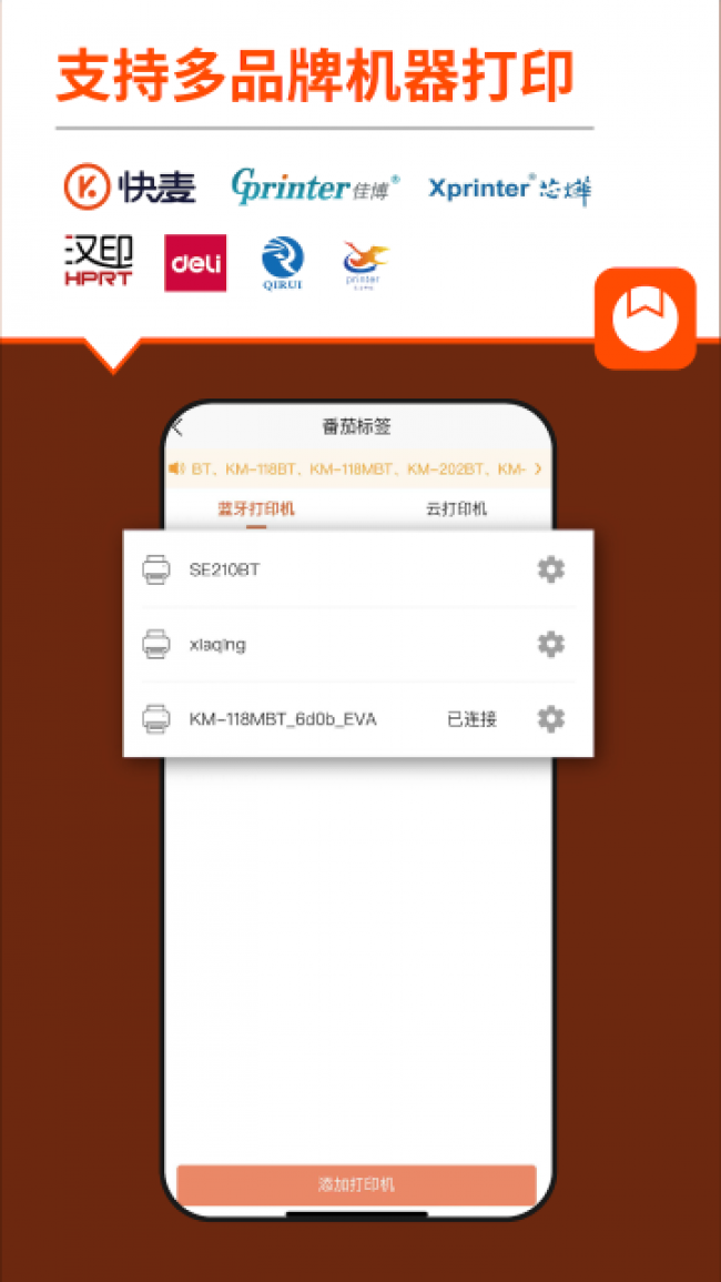 1、番茄标签软件手机蓝牙连接打印,支持佳博、得力、汉印、芯烨、快麦、启锐、辰芯、得印等多品牌打印机。