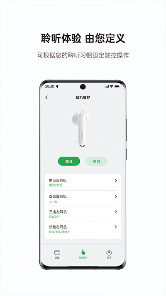 1、支持便捷查看耳机和耳机充电盒电量,支持自定义耳机操控,可修改“双击”,“三击”等耳机触控操作。