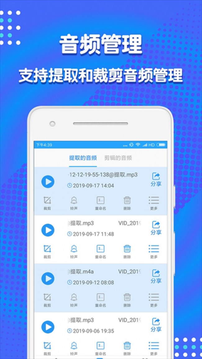 3、还提供音频剪辑功能,无论是提取的音频文件还是手机中的音频文件,都可以随你剪辑,保留自己喜欢的部分。