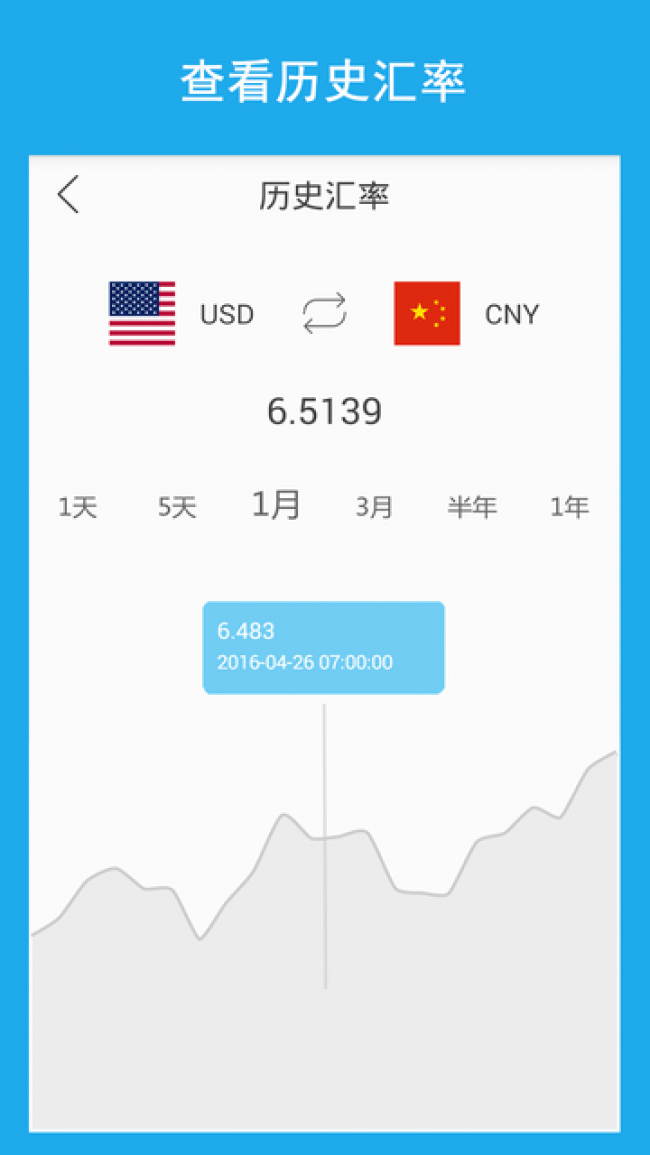 3、在列表上向左滑动还可以查看历史汇率,支持160多种货币,查看历史汇率走势。