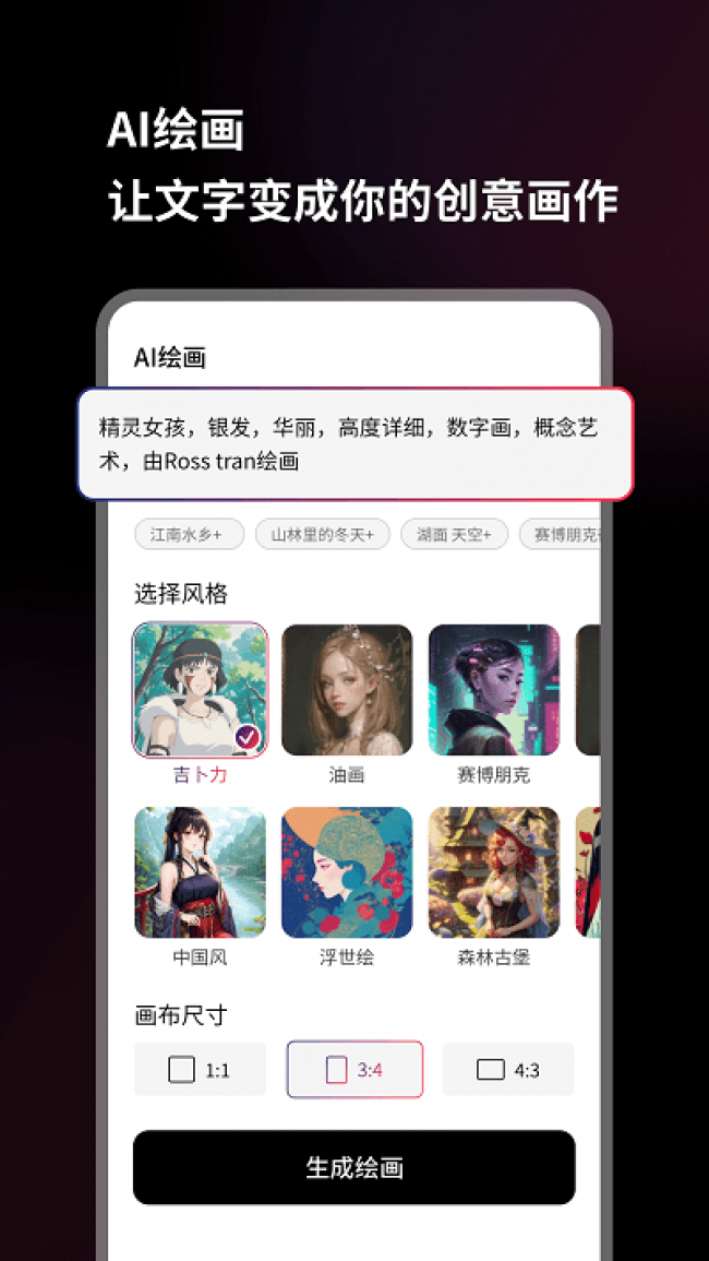 1、AI绘画,让文字变成你的创意画作,海量作品,拥有同款作品;
