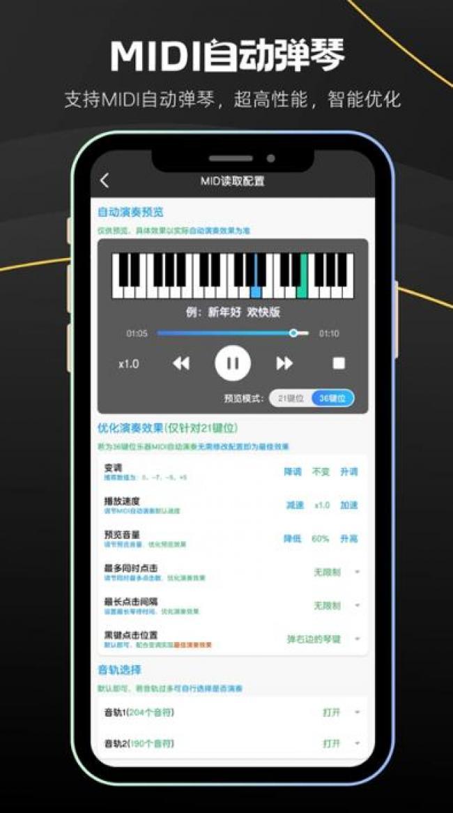 2、菜菜音乐盒app支持导入MIDI文件实现自动弹琴,支持智能调音等多种配置,可实时预览。