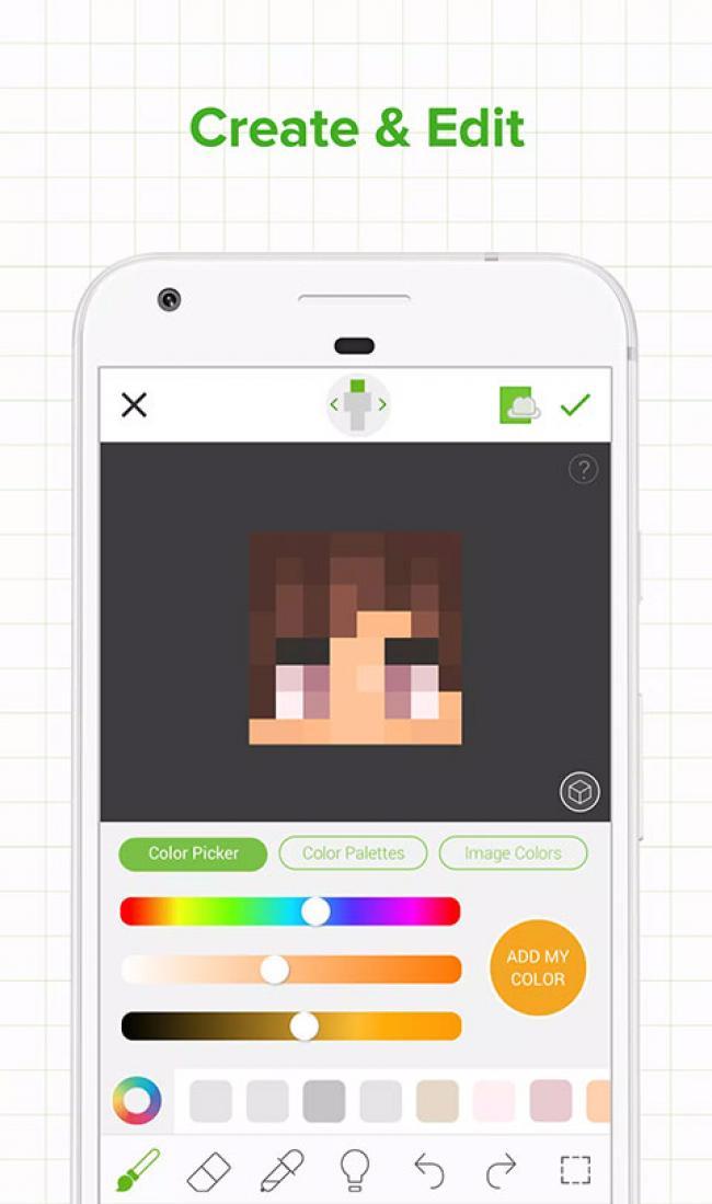 3、编辑皮肤,本应用提供了强大的工具供您使用,包括铅笔、色轮、色盘、橡皮擦、放大和缩小工具、移动工具等等。