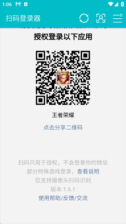 1、游戏扫码登录器扫码就可以了,App会自动生成对应的二维码,然后使用设备扫码即可。