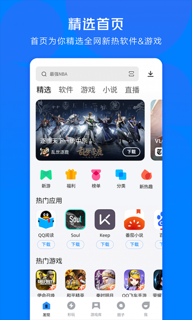 应用宝app下载安装安卓版全新架构的视觉界面,简洁大方清新动人精心构想的首页布局,别致新颖更胜从前