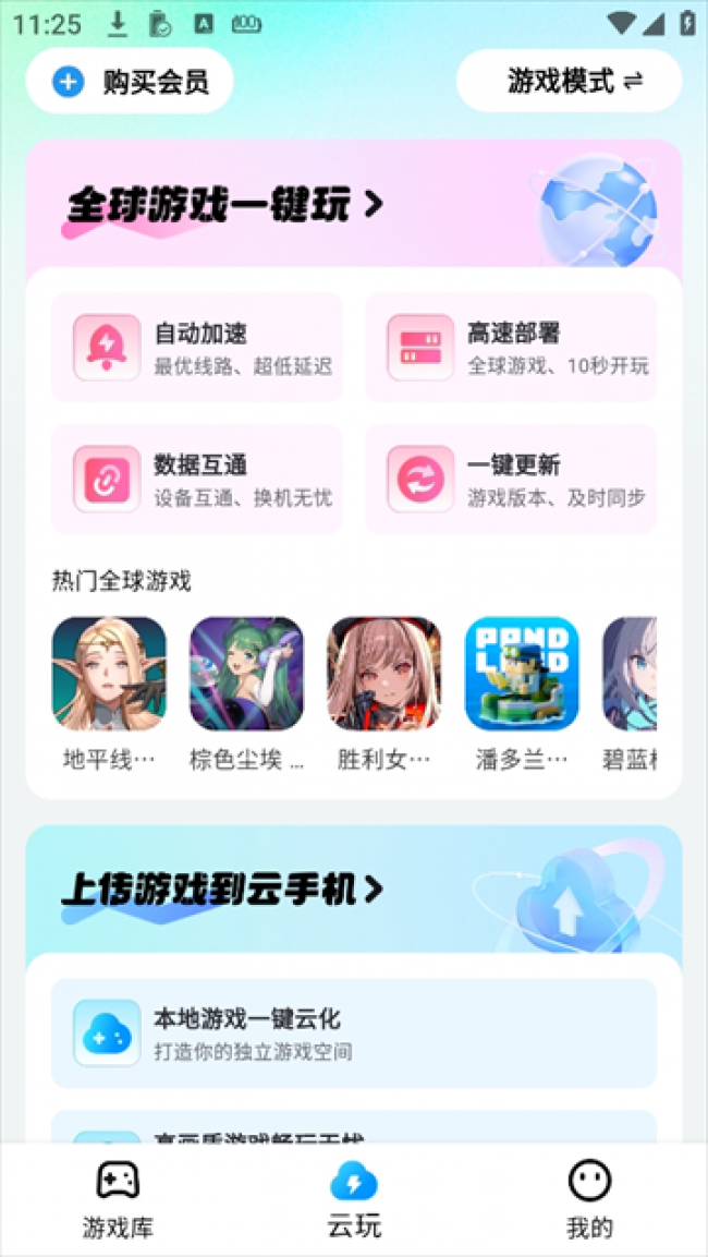 1、本地游戏一键上传制作属于自己的云游戏中心,全球正在流行的游戏一键畅玩。