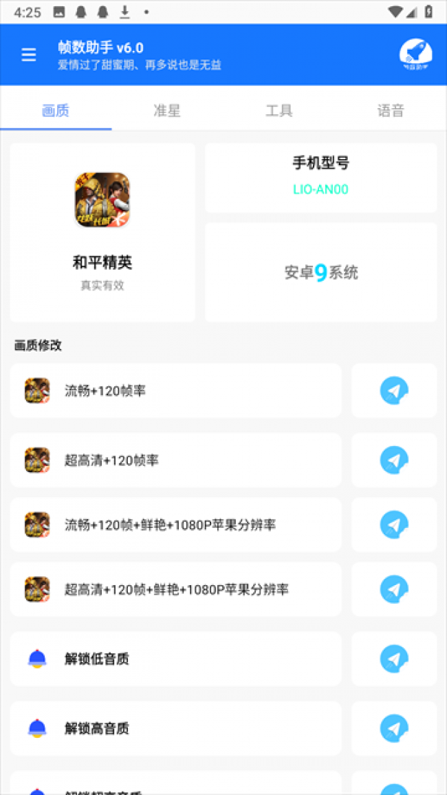 3、根据自己的设备和游戏版本选择画质修改帧率,提高你的游戏画质的品质。
