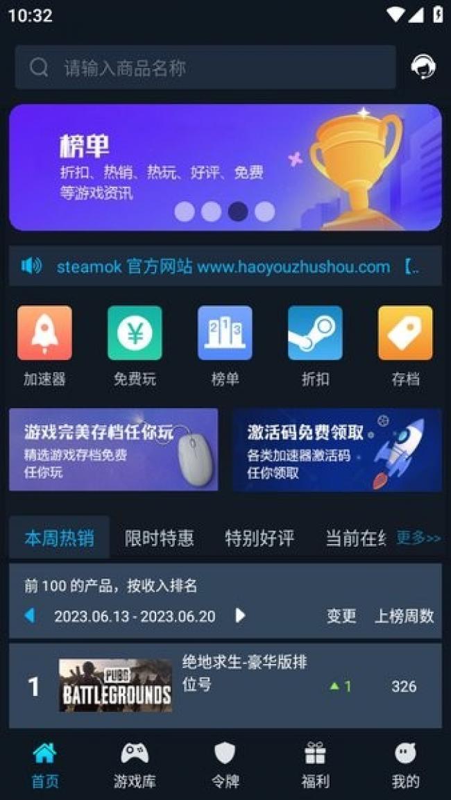 2、在首页界面可以查看免费游玩的游戏,游戏榜单,游戏折扣和可使用存档的游戏等。