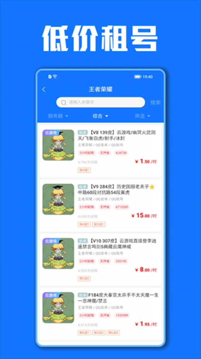 3、提供当下热门游戏(王者、lol、和平精英等)、火爆新游的账号出租
