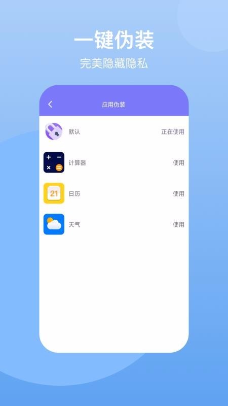1、丰富的应用伪装图标选择,这里为用户设置了常见的计算器、日历和天气伪装图标。