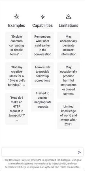 CHATGPT中文版免费版下载是一款超级好用的人工智能AI服务平台,它可以轻松帮助所有用户解决生活中的一切需求,无论是在社交方面还是学习,以及工作,娱乐休闲等都可以轻松满足,您只需要注册登录,即可看到干净大方的界面,操作简单便于使用,您可以与它进行自由交流互动,无论是问吃喝玩乐,衣食住行,知识问答等,包括但不限于询问今日的天气如何,怎么谈恋爱,怎么交到真心的朋友,如何玩好一个游戏,怎么制作一道美食,PPT怎么才能做的更完善,编程遇到的BUG怎么迅速解决等,让您的问题都可以得到详细明了的解析与答案,喜欢的伙伴们快来下载试试吧。