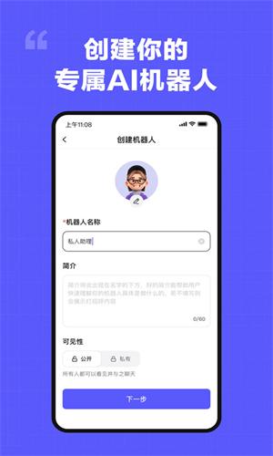 2、高自由度的角色定制与互动:不仅提供丰富的预设AI角色,还支持用户自定义智能体,从人设到对话风格均可个性化设计,满足多样化的互动需求,让虚拟角色更贴合用户期待。