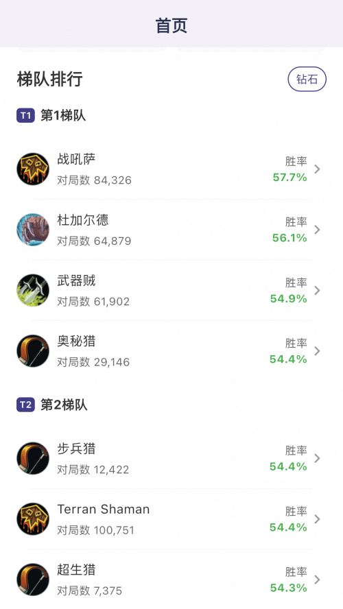 1、实时更新各职业在天梯中的胜率,让您了解当前版本的职业强弱,选择最适合自己的职业上分。