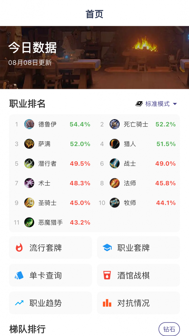 1、卡组之家app随时查看不同职业的最新胜率数据,了解当前游戏环境,选择最具优势的职业进行对战。