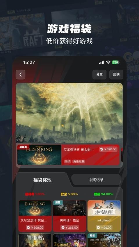 3、可升级兑换更高阶游戏!隐藏→欧皇→超稀有三档自由跃迁,让每个福袋都成为通往梦想游戏的阶梯。