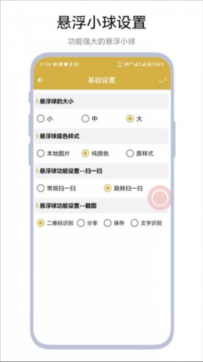 1、能够在软件里设置悬浮球的透明度和大小,悬浮球会显示在手机界面上。
