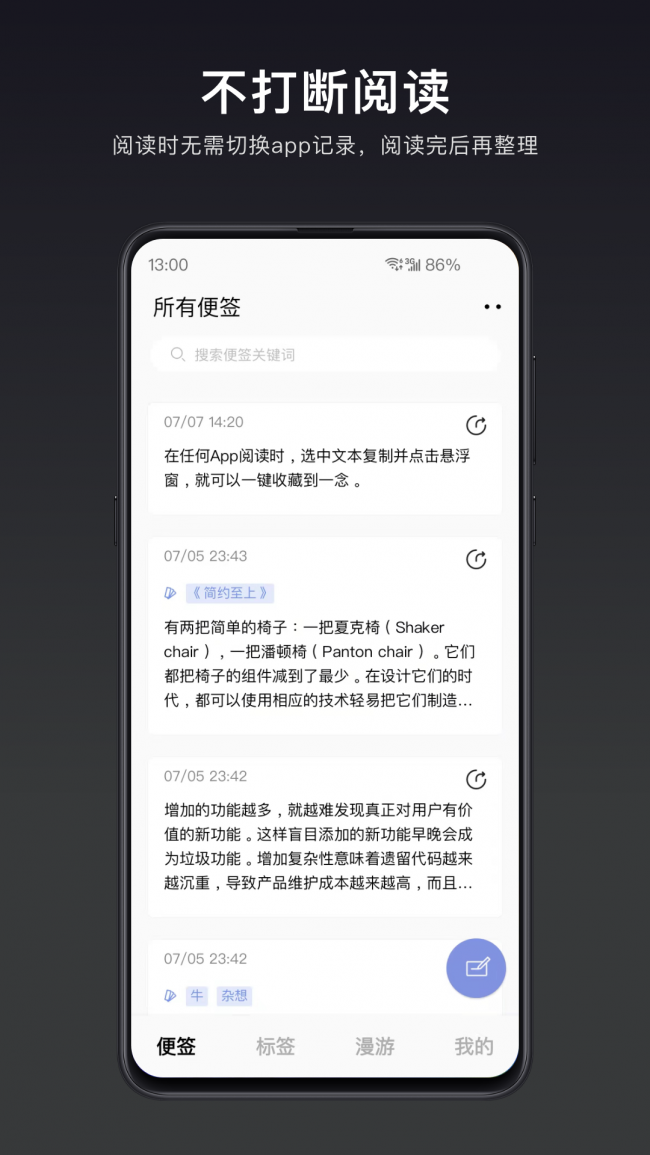 一念app下载安装是一款轻量化的手机备忘录,用户可以很好的通过它来记录下各种重要的事情,不管是在阅读时的灵感短句、日常生活中的美好事物还是工作当中的重要事项等,都可以通过它来进行记录,满足你的所有记录需求,还可以将所有记录的内容进行详细的分类整理,这样可以更加方便用户随时进行查看,而且全程没有任何的广告弹窗为你打造一个干净绿色的日记本,还可以为你提供悬浮窗功能,你可以在阅读的时候直接将自己喜欢的短句进行复制保存到其中,并且这个过程是不需要退出也不会打断你的阅读,为你提供一个最便捷的记录方式。喜欢的伙伴们快来下载试试吧。