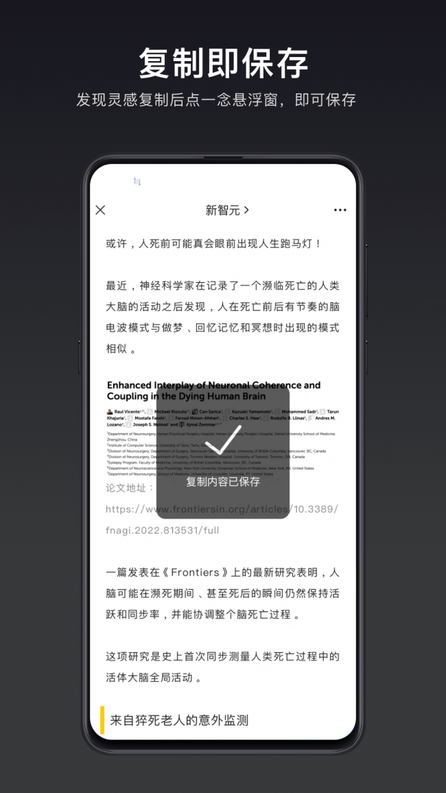 3、遇到有深度的句子、段落时,复制就会直接保存至一念里。