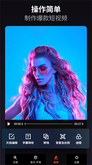 1、专属视频定制,专属主题、滤镜一键应用,彰显个性视频。